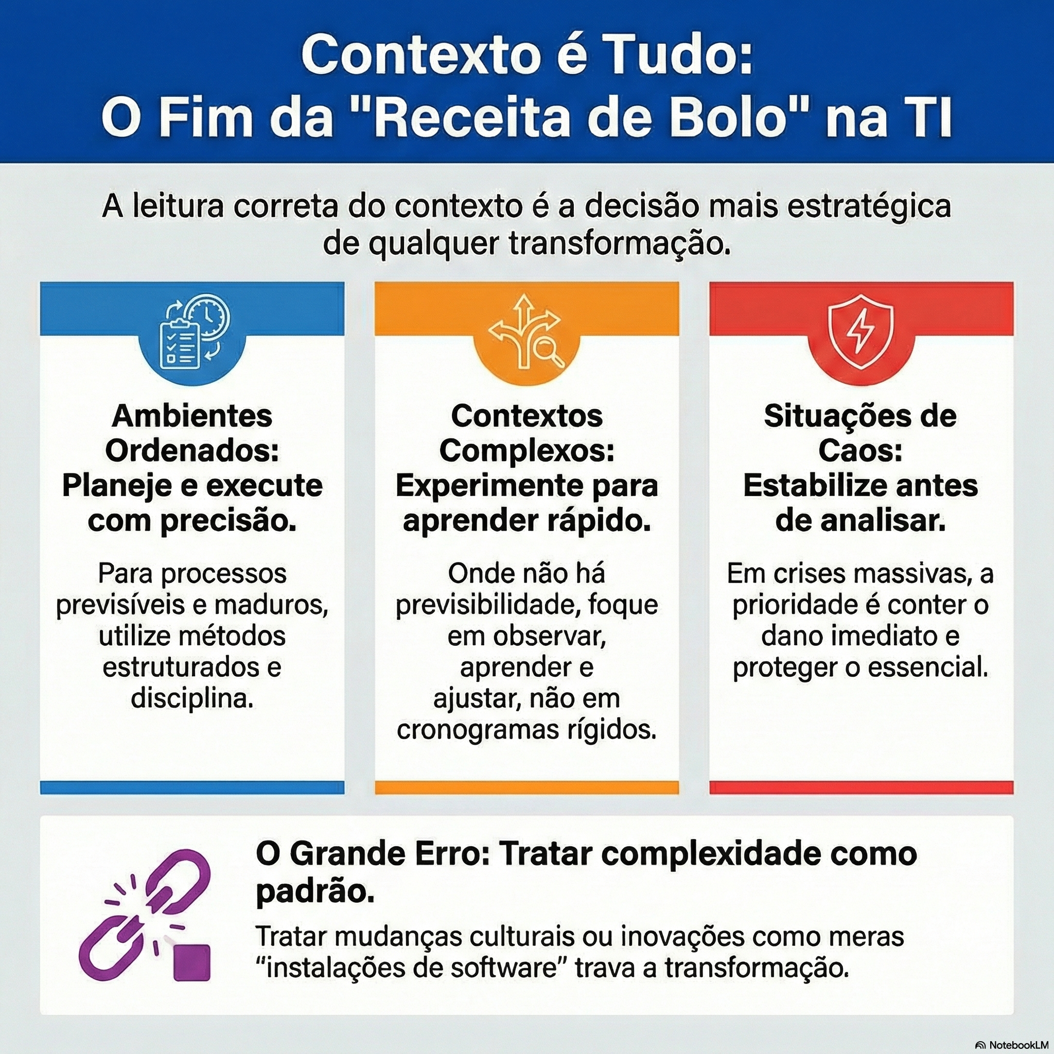 E isso parece óbvio, mas na prática é o erro mais comum em transformação organizacional. Empresas insistem em aplicar o mesmo modelo de projeto, o mesmo tipo de governança, o mesmo ritmo de planejamento e o mesmo estilo de controle para situações completamente diferentes. O resultado? Frustração, lentidão, conflitos internos e aquela sensação de que “a transformação não anda”, mesmo com todo mundo trabalhando duro.